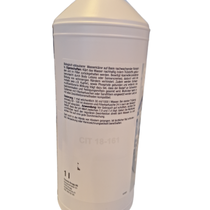 Dosierung: 1 mal wöchentlich 20 ml/1000 l Wasser. Bei starker Trübung einmalig 50 ml dosieren und Filterkartusche 24h nach der Behandlung gut abspülen.