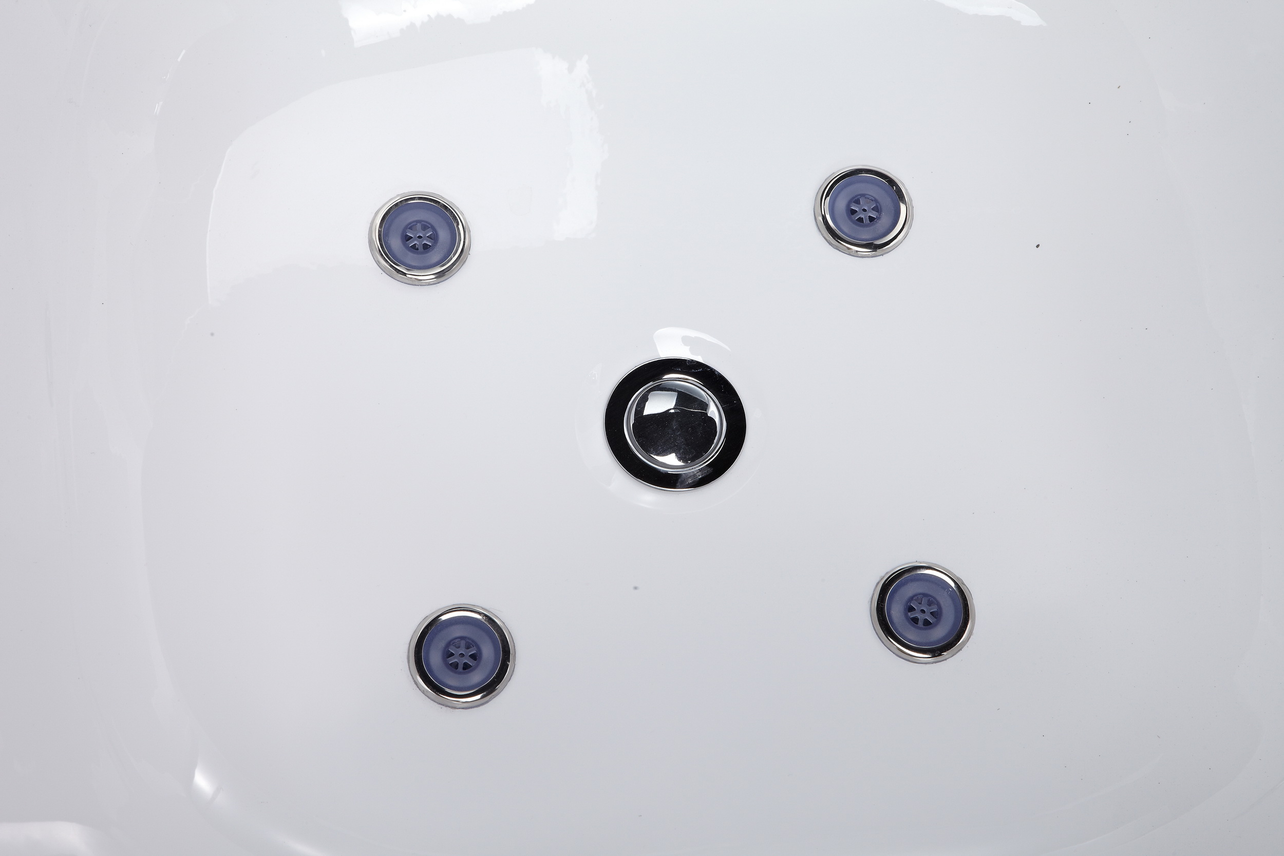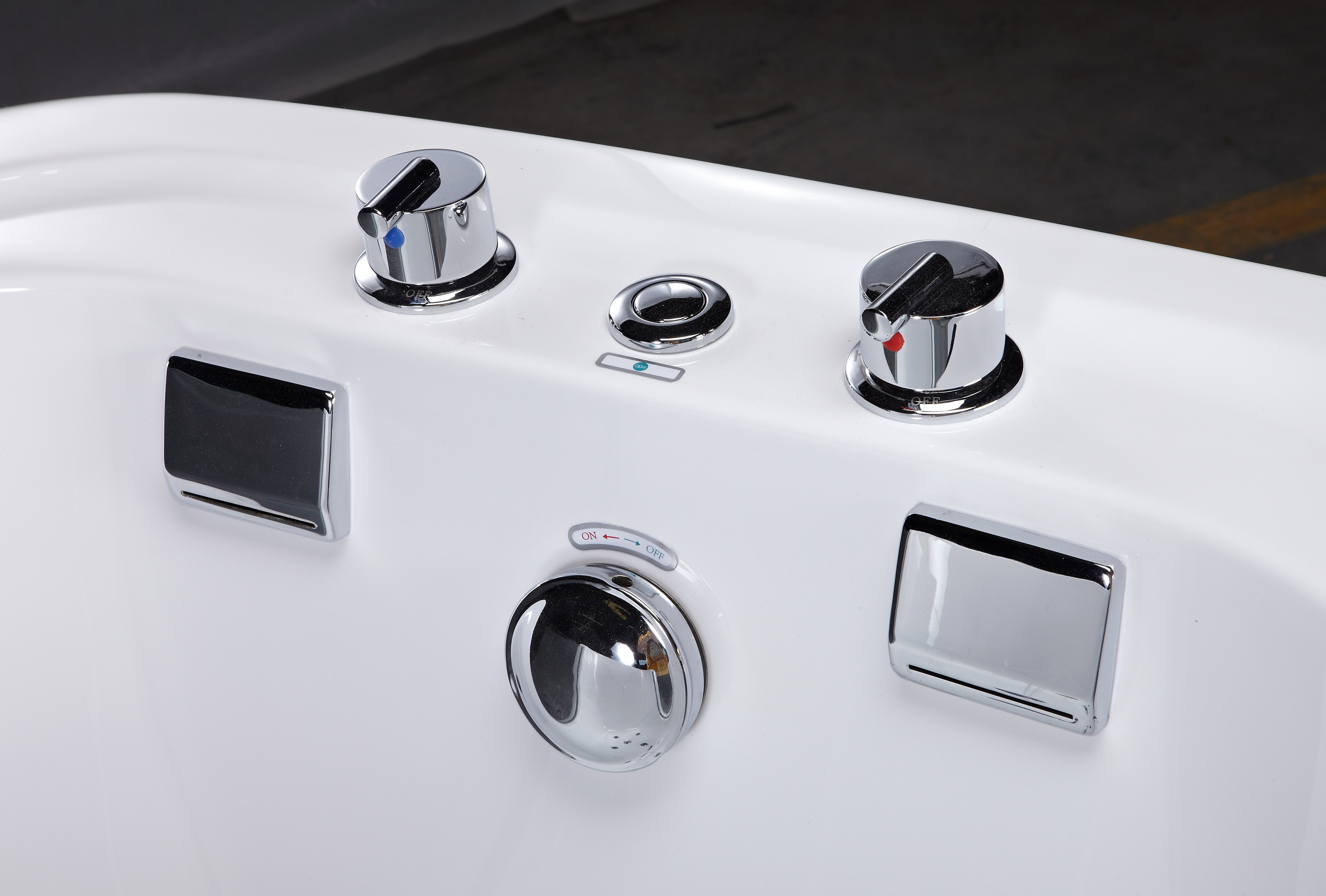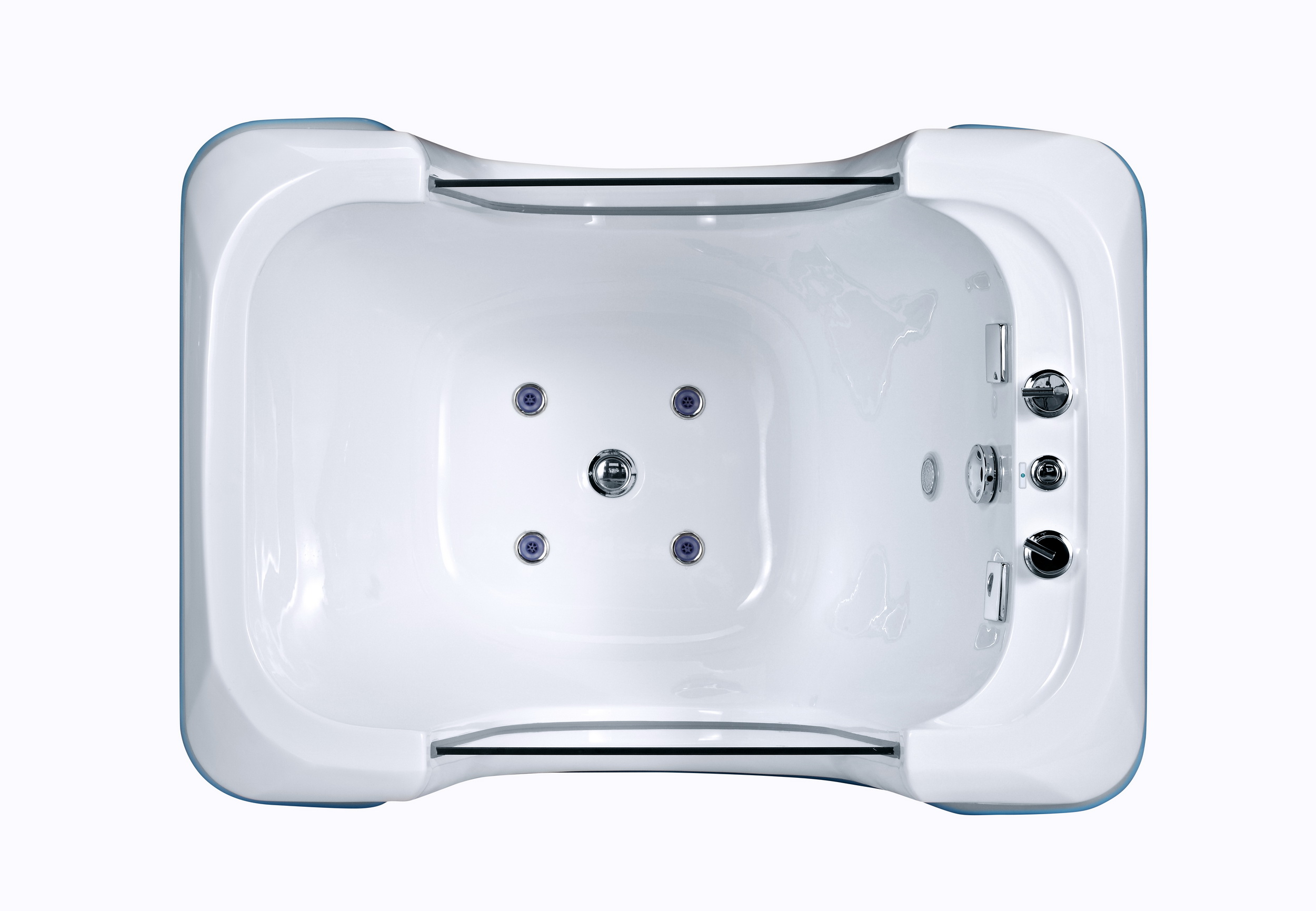 Der TinyBubbles Baby Spa verfügt über einen kalt-/warm-Wasser Anschluss, 4 Luftdüsen und 1 Massage-Jet. Standardmässig ist die Handbrause bei uns mitinstalliert. Auffällig sind die zwei Sichtglas-Seitenwände!